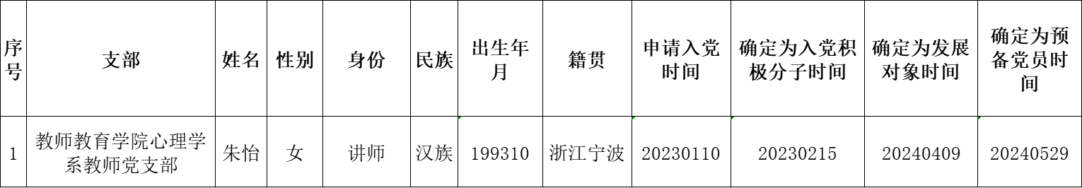 党委会集体审议讨论了朱怡同志的接收问题。党委委员共7名,实到会7名。经逐个审议和表决,7名党委委员一致认为朱怡同志已具备预备党员条件,同意批准接收为中共预备党员,预备期为2024年5月29日至2025年5月28日。具体信息如下: