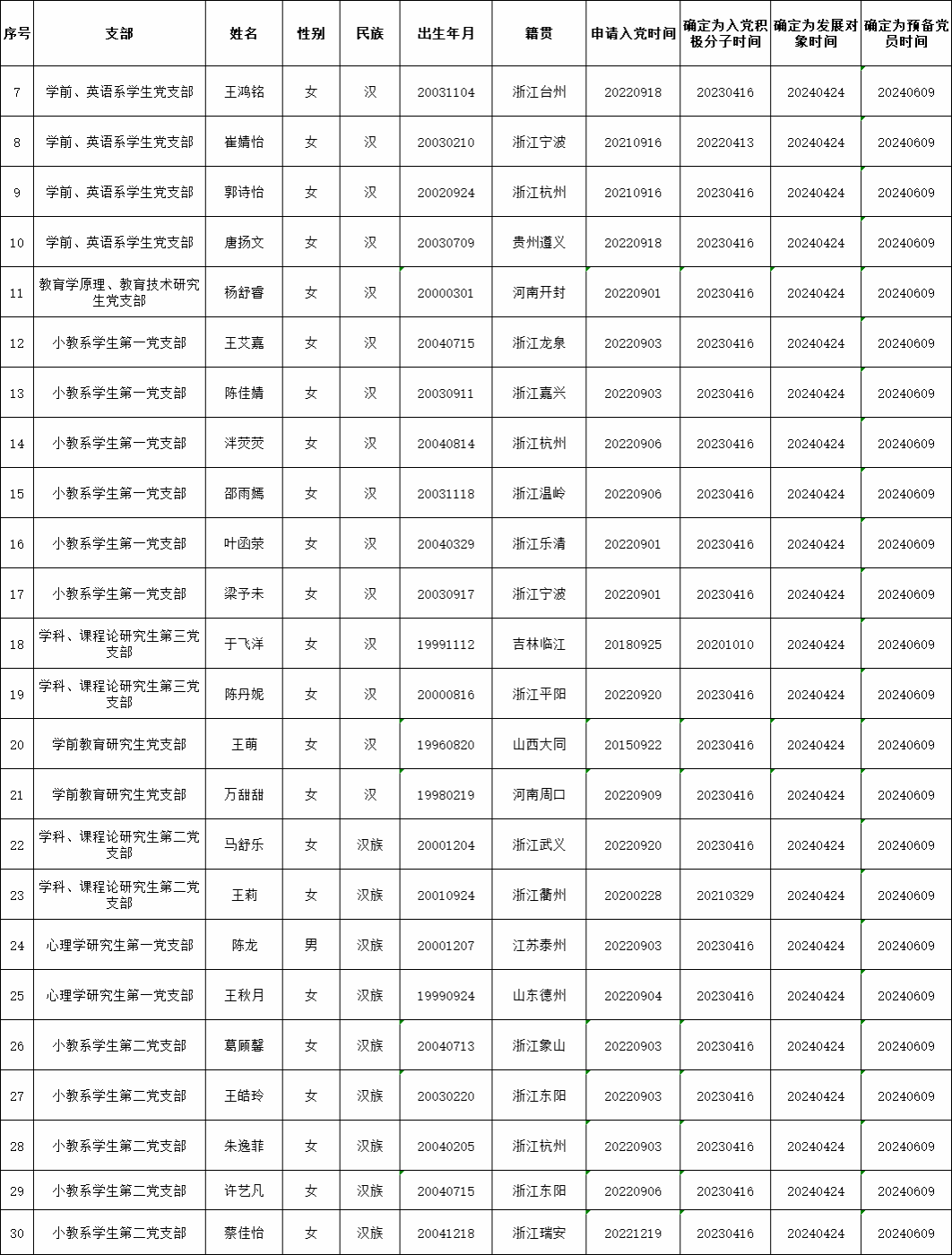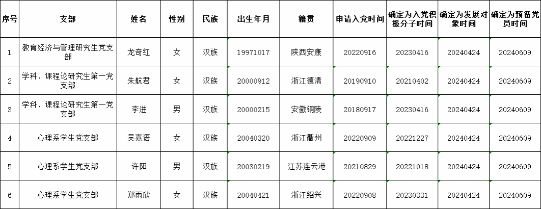 党委会集体审议讨论了龙奇红等30名同志的接收问题。党委委员共7名,实到会7名。经逐个审议和表决,7名党委委员一致认为龙奇红等30名同志已具备预备党员条件,同意批准接收为中共预备党员,预备期为2024年6月9日至2025年6月8日。具体名单公布如下: