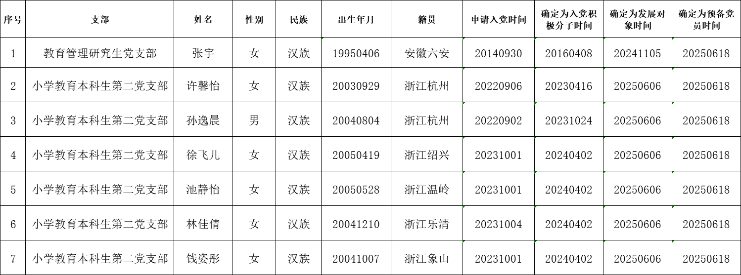 党委会集体审议讨论了张宇等35名同志的接收问题。党委委员共7名,实到会7名。经逐个审议和表决,7名党委委员一致认为张宇等35名同志已具备预备党员条件,同意批准接收为中共预备党员,预备期为2025年6月18日至2026年6月17日。具体名单公布如下: