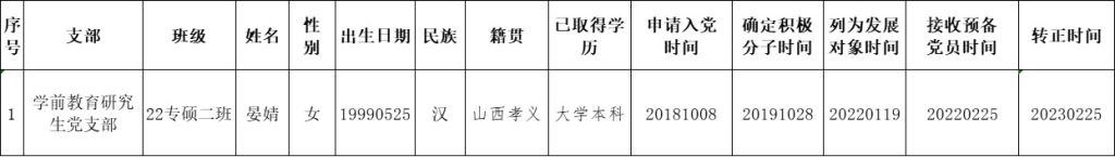 党委会集体审议讨论了晏婧同志的转正问题。党委委员共7名,实到会7名。经逐个审议和表决,7名党委委员一致认为晏婧同志已具备正式党员条件,同意批准按期转为中共正式党员,党龄从预备期满转为正式党员算起。具体名单公布如下: