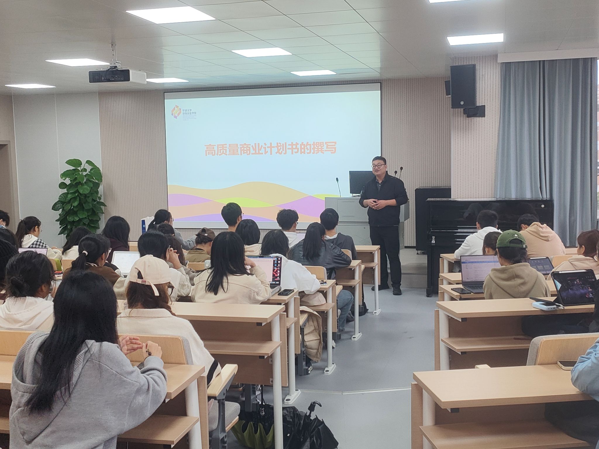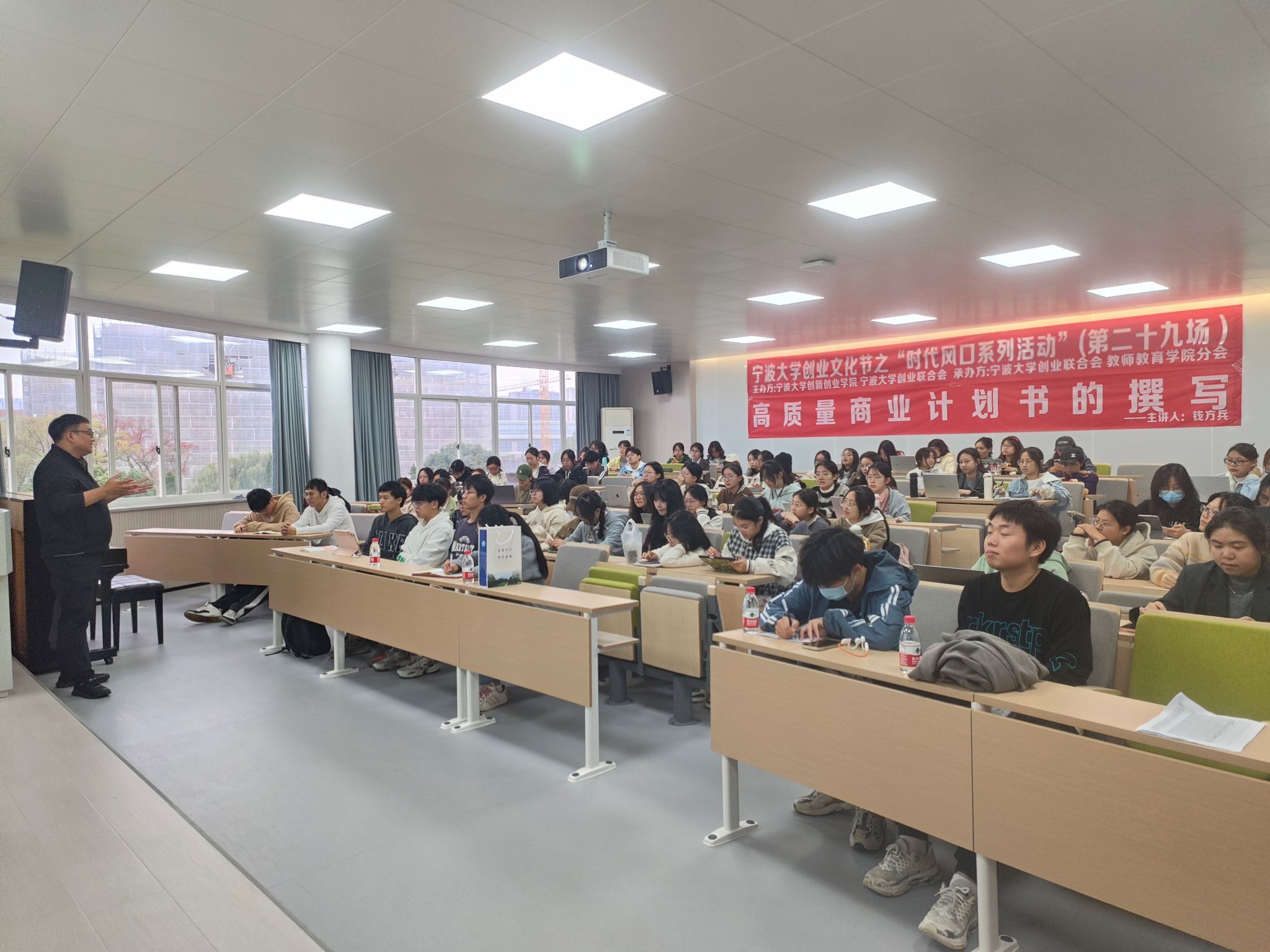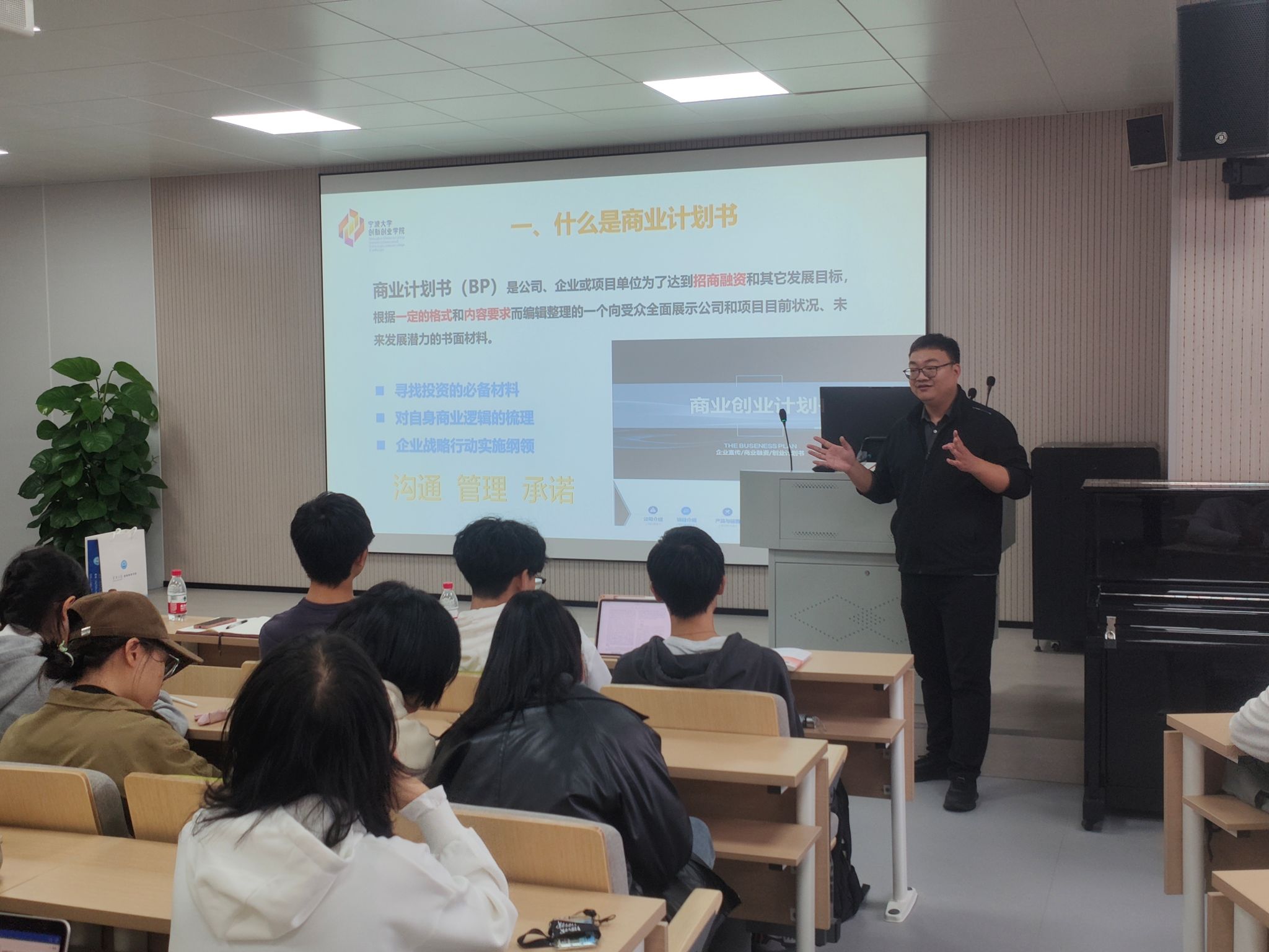 的钱方兵老师。讲师为同学们普及了撰写商业计划书相关知识,解答学生在有关商业计划书面的的疑惑,鼓励和帮助大家写出更高质量的商业计划书。钱方兵老师列举多个例子为我们生动的讲解了撰写商业计划书的步骤,先是认清商业计划书的对象,比如企业家和投资人的区别。接着,钱方兵老师指出了项目主要存在的三种问题,减少同学们撰写的失误,并阐释了好的商业计划书所应该具备的四个特点,让同学们有更明确的撰写商业计划书的方向。而后,通过对高质量商业计划书重点和内容的讲解,钱老师让同学们更深入地了解了商业计划书不同板块的要求,比如PPT的页数、封面的名字、市场分析和运营模式等。同学们通过本次讲座更好地充实了关于商业计划书的知识,也帮助他们在日后撰写高质量商业计划书时能有更充分的准备。