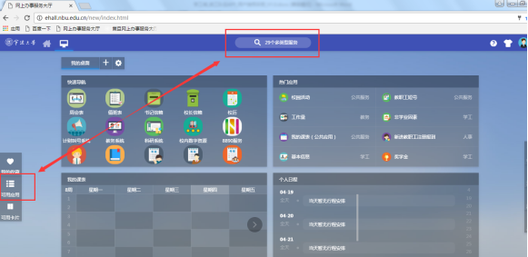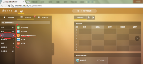 或在“可用应用”界面点击学工栏目找到“家庭经济困难学生认定”应用。