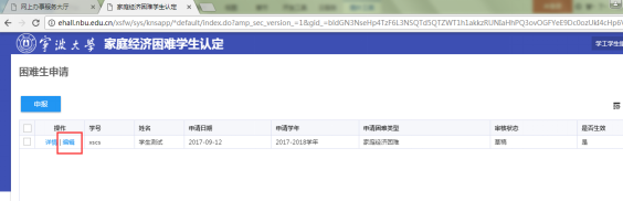 3. 如老师退回修改,点击这条申报记录前的“编辑”按钮进入家庭经济困难学生申报页面,修改后点击“提交”再次提交给老师审核。
