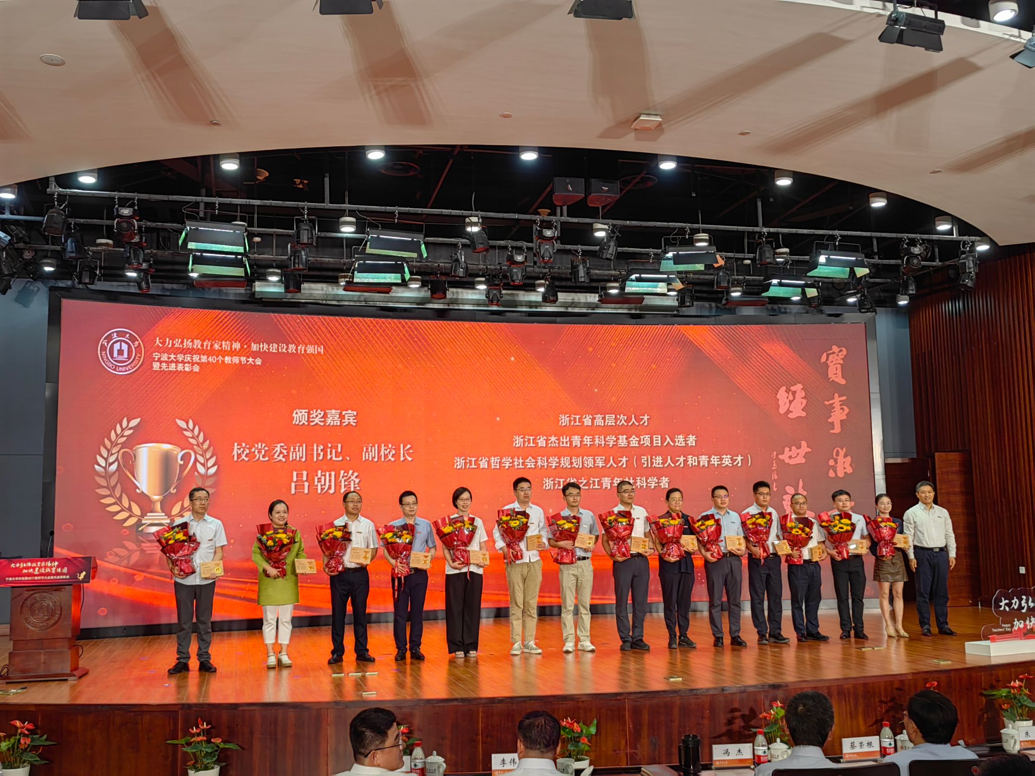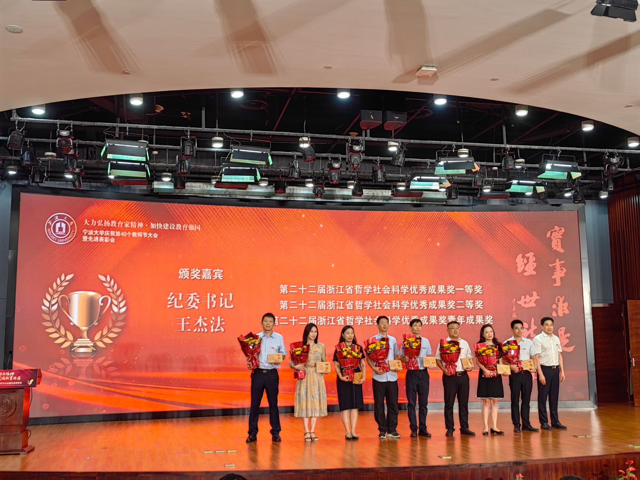 获得第二十二届浙江省哲学社会科学优秀成果奖二等奖的孙立新老师(左二)、获得第二十二届浙江省哲学社会科学优秀成果奖青年成果奖的于潇老师(左五)和冯丽娜老师(右三)颁奖