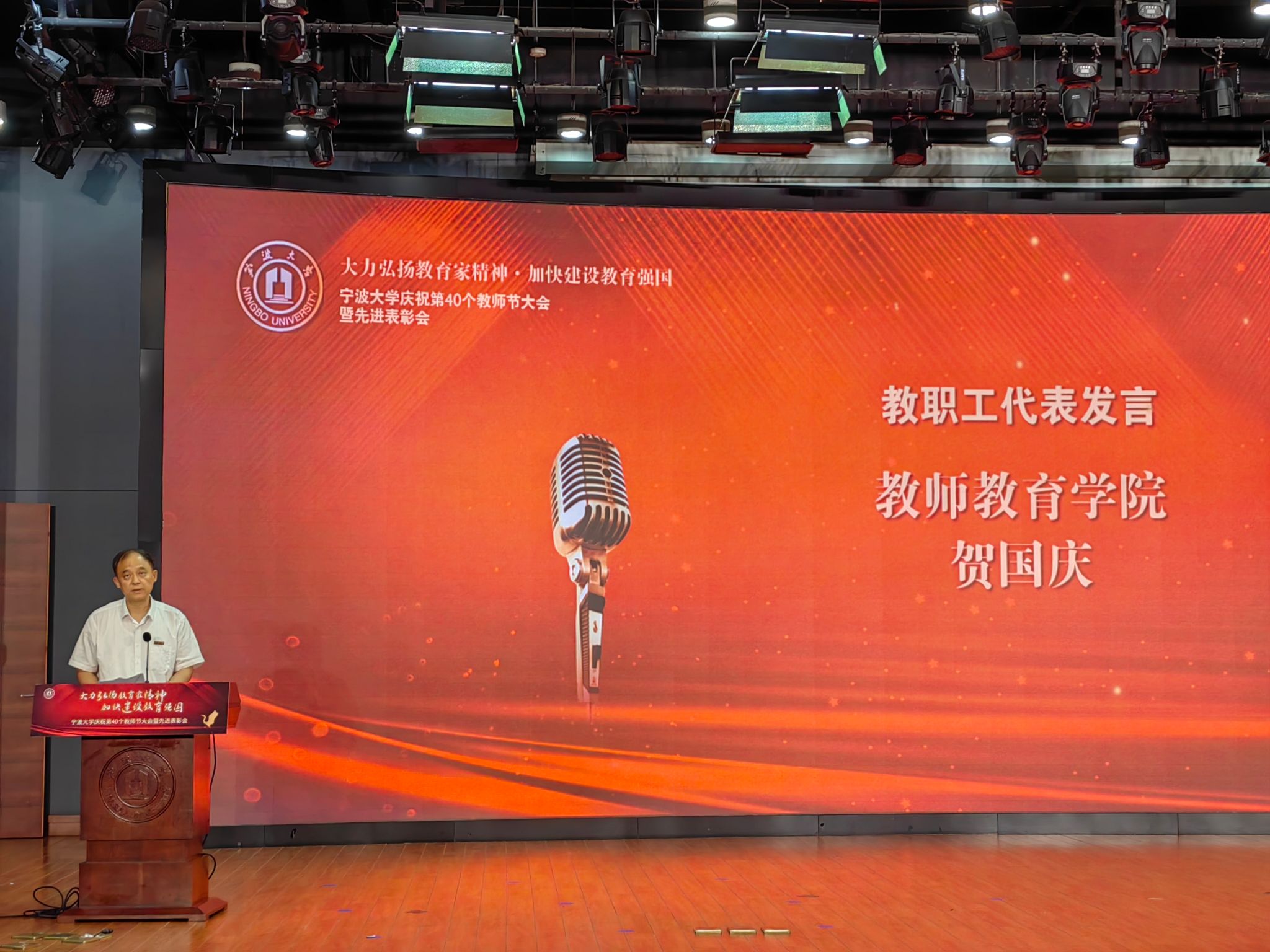 特聘院长贺国庆老师作为优秀教职工代表上台发言,向大家分享自己从教四十多年的切身体会。贺老师的话语引起了现场不少老师的共鸣,同时激励着大家要在教师这个岗位上厚积薄发,砥砺前行。