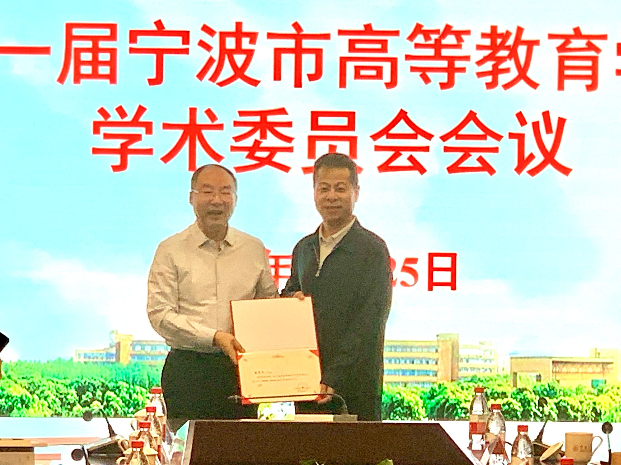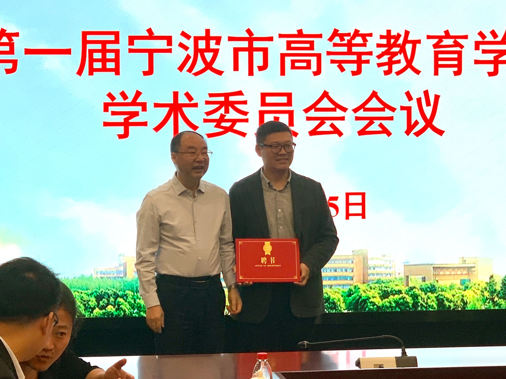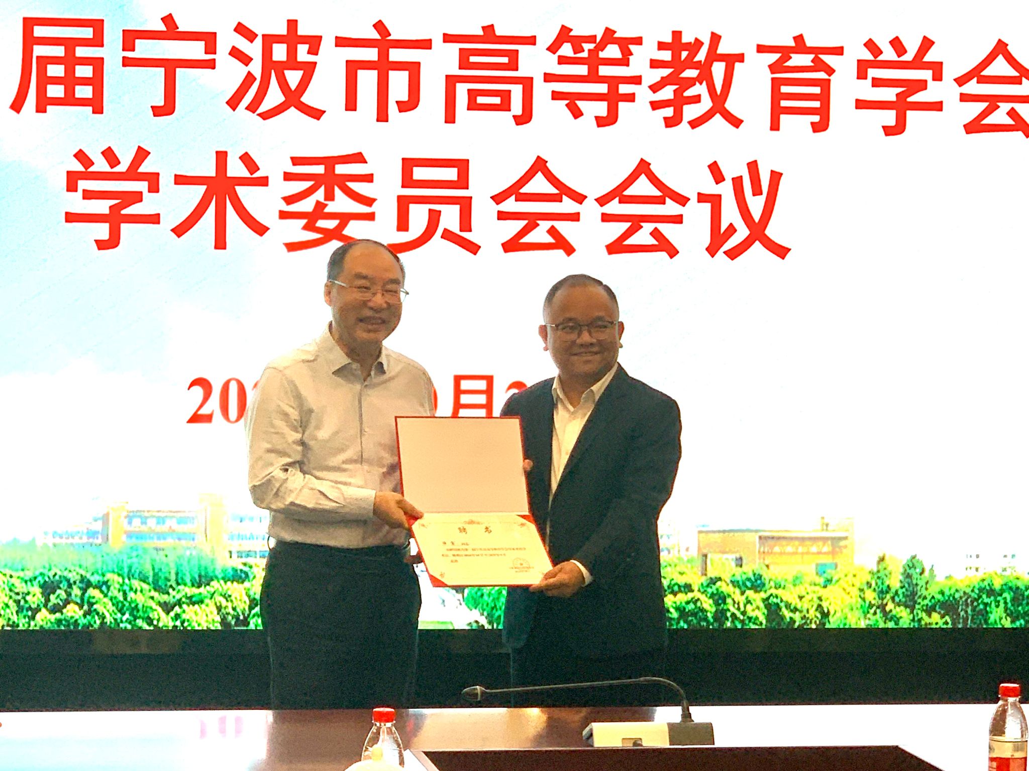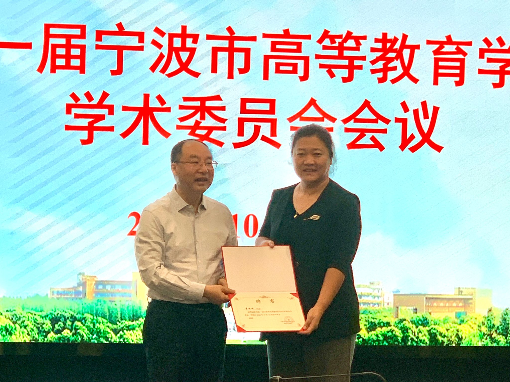 党委委员潘菊素副院长宣读宁波市高等教育学会学术委员会成立和第一届宁波市高等教育学会学术委员会名单。由学术委员会主任胡赤弟教授为与会成员颁发第一届宁波市高等教育学会学术委员会聘书。