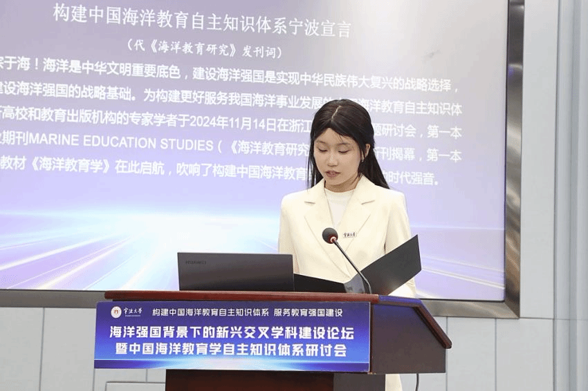 图:研讨会现场发布《构建中国海洋教育自主知识体系宁波宣言》