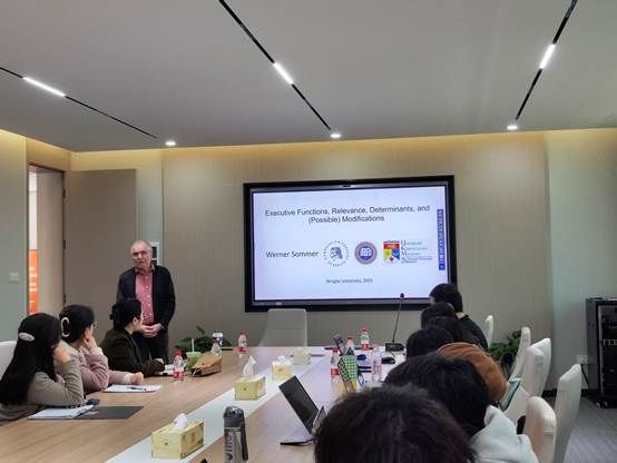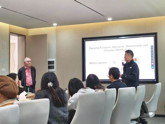 对Werner Sommer教授的到访表示热烈欢迎。在此次讲座中,Werner Sommer教授系统阐释了执行功能的三大核心要素——工作记忆、抑制能力和认知灵活性,着重剖析了抑制功能在行为调控中的核心作用。教授还介绍了“热执行功能”这一前沿概念,它涉及情感和社交方面的行为控制,这表明执行功能不仅限于冷认知(如逻辑推理),还涉及情感驱动与社交情境中的执行功能调控机制,为理解人类决策行为提供了新视角。此外,他提到执行功能受损与药物依赖、超重等行为问题密切相关,并分享了通过运动练习和正念训练改善执行功能的最新研究成果。