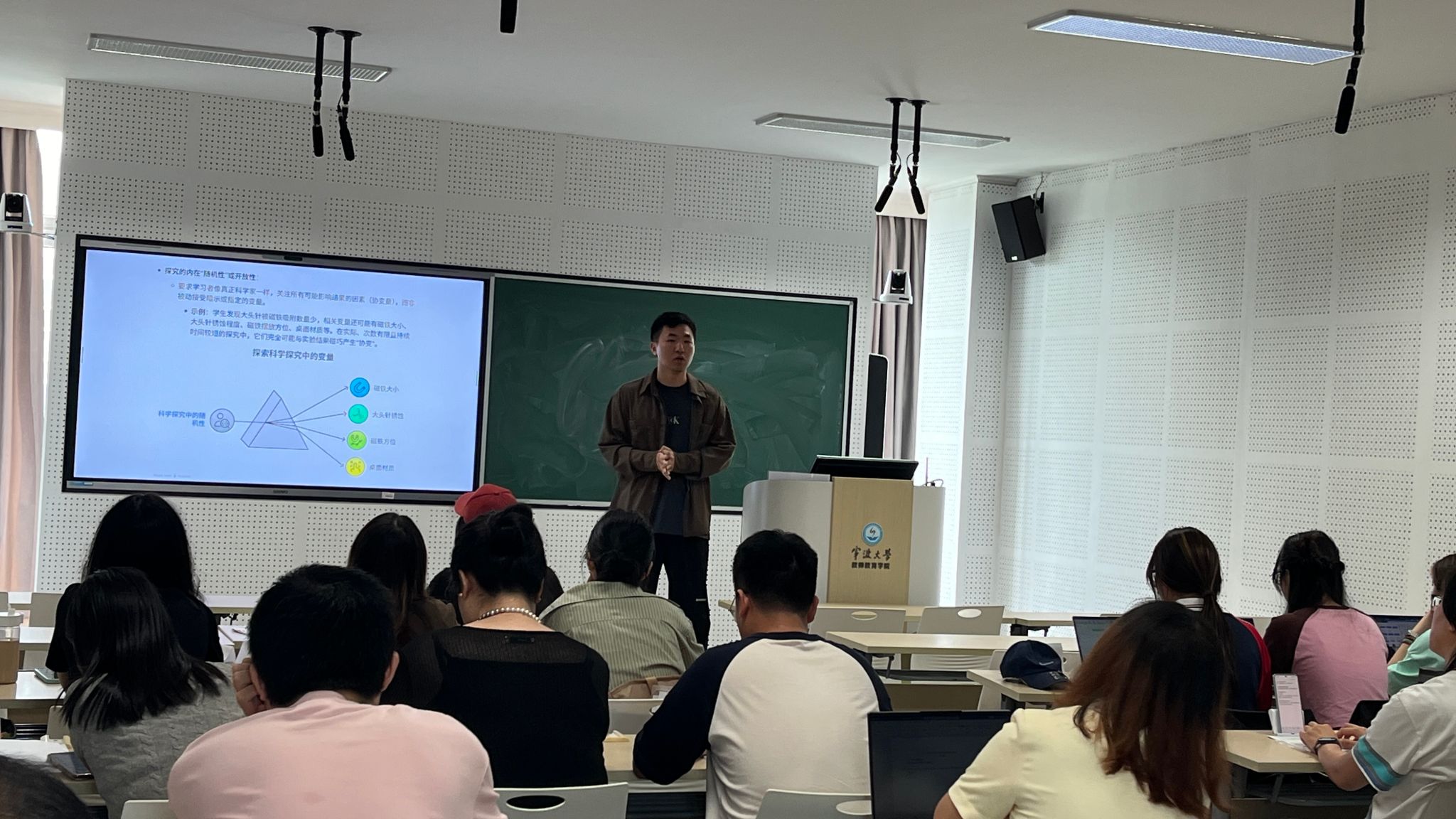 在AI辅助教学的讨论中,孙老师认为教师应始终对技术生成内容保持审慎态度,坚守学术诚信,以身作则引导学生树立严谨治学的态度。此外,课程通过“磁铁的磁性”等教学案例,结合“小磁铁士兵”等形象类比,帮助师范生掌握将复杂知识转化为小学生易懂模型的能力,体现了科学思维与教育实践的紧密结合。