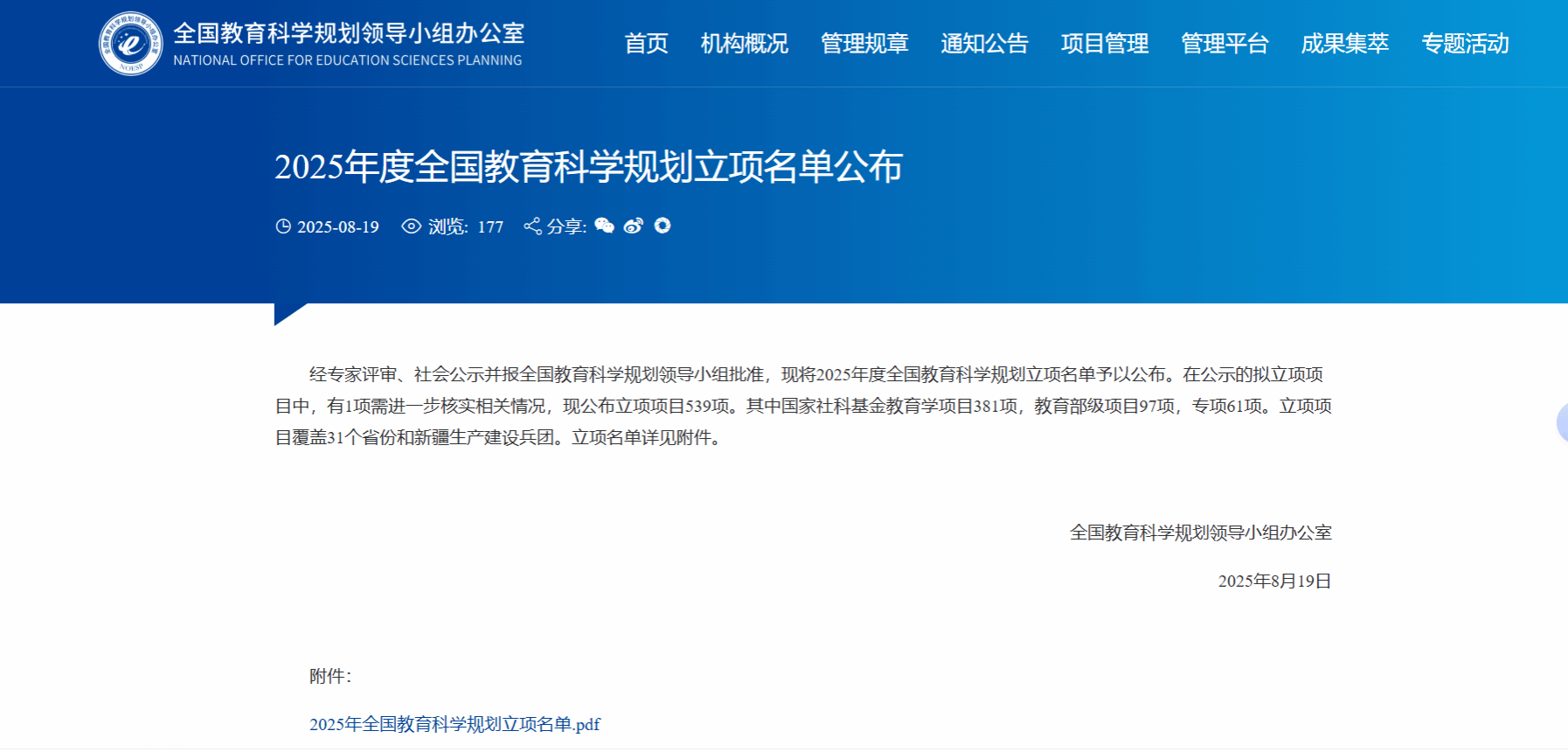 2025年8月19日,全国教育科学规划领导小组办公室公布《2025年全国教育科学规划立项名单》,51黑料