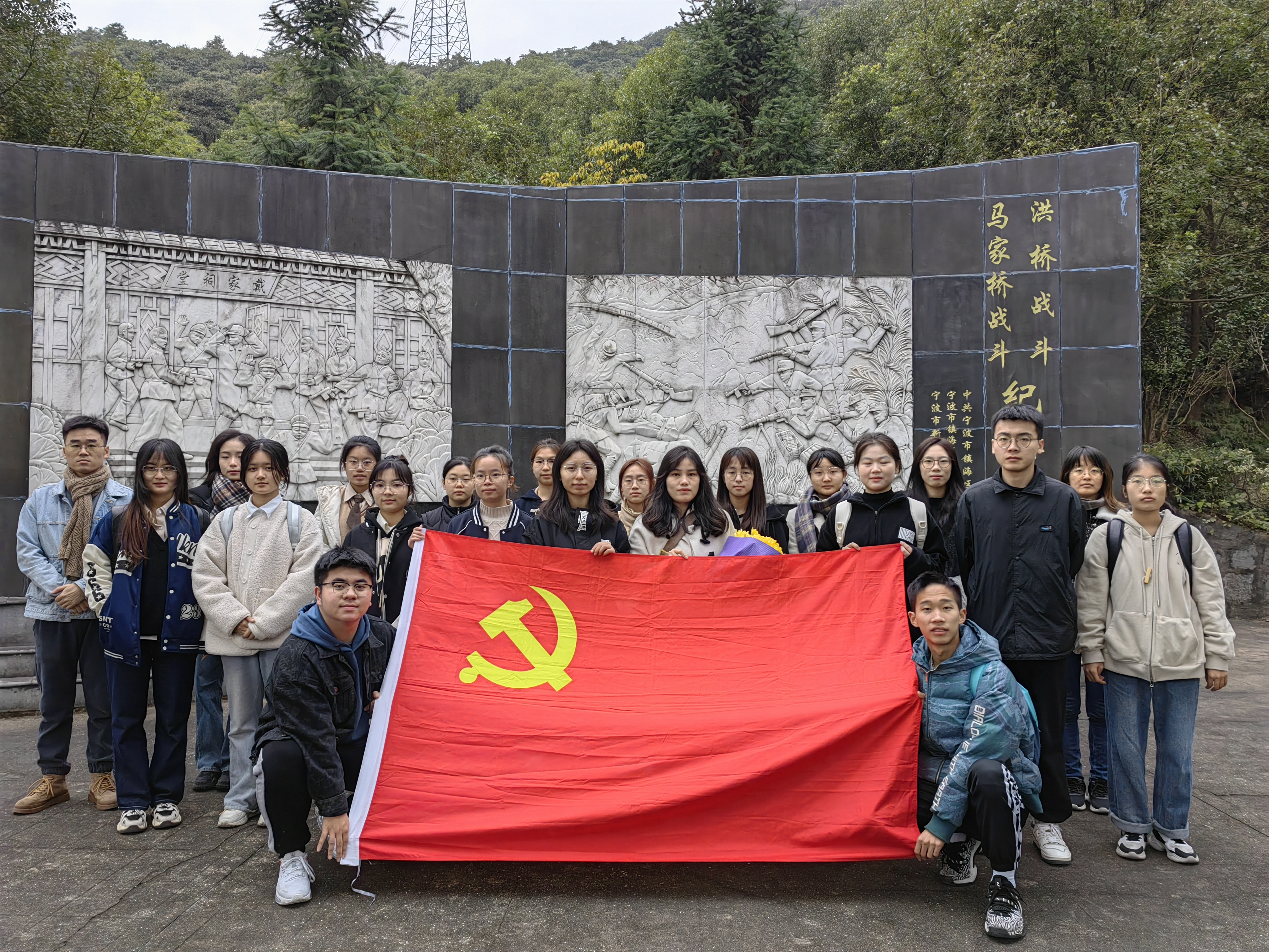 第二站同志们前往烈士纪念碑和思源亭,缅怀革命先烈。张星雨老师介绍:“九龙山抗日纪念碑位于思源亭侧下方,纪念碑长10米,高4.5米,由汉白玉和花岗岩堆砌而成。纪念碑上雕刻着新四军战士英勇战斗的画面:抗战时期,新四军为了拔掉盘踞在镇海和慈东平原的敌人据点,向敌人发动了一系列的战斗,其中镇海的洪桥战斗、马家桥战斗影响最大,沉重打击了日伪军的嚣张气焰。”
