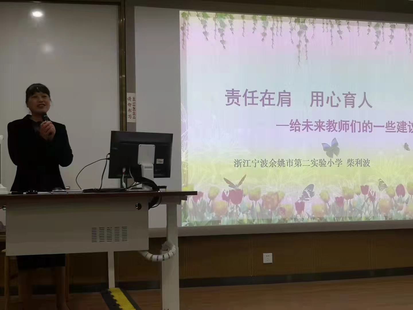 长,宁波市人大代表,高级教师。曾荣获宁波市第三届数学名师,宁波市第六届名校长,浙江省优秀教师等多项荣誉。本次讲座中,柴校长由浅入深,开始便抛出三个问题:“教育是什么”“教师是什么”“教师要干些什么”。围绕着这三个问题,柴校长仔细阐述了关于教育的概念和切身感想,举出多个小学教学中遇到的各类问题,点出作为教师应对课程标准和教材读通、读懂、读明白,令在场师生收获良多。