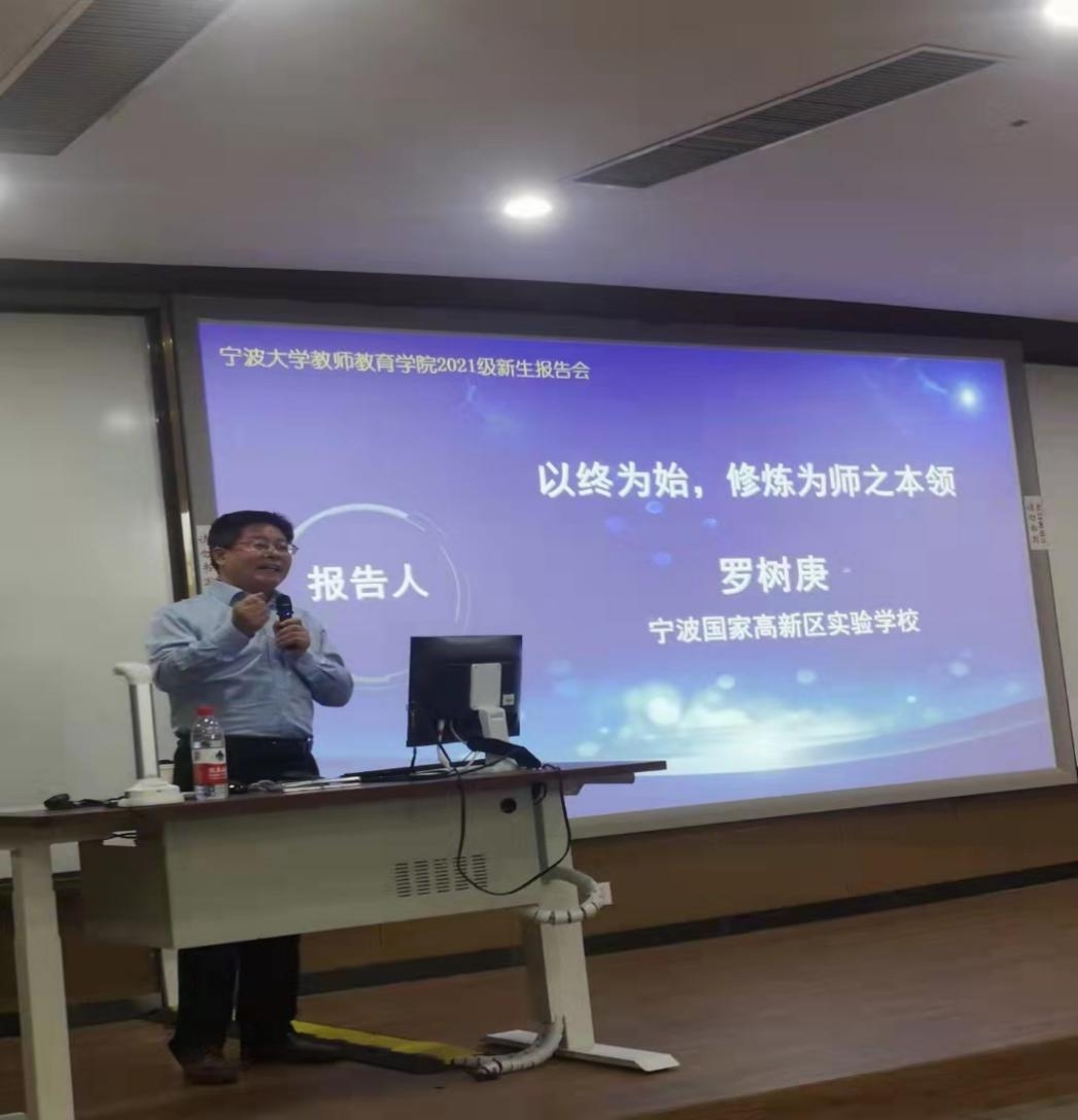 教育集团党支部书记、校长,浙江省特级教师,正高级教师,宁波市名师、名校长,甬派教育管理名家培养对象,宁波市领军拔尖人才,浙江省师德标兵,全国科研先进工作者,全国青年教师教学艺术大赛一等奖获得者。本次讲座中,罗树庚校长由浅入深,层层递进。讲座还未开始便播放了两个视频来吸引同学们的注意,并自然地抛出了问题:“我是谁”,“我要去哪儿”,继而发问“我准备怎么去”。围绕于此,罗校长告诉了我们当前教师竞聘的激烈,也劝诫我们如何才能不虚度未来的四年。因此,罗校长提出了“沉潜积淀”“练基本功”“勤读善思爱写”“专题阅读”“系统思考”“目标引领”等六方面的建议,每一个建议都由一个个生动的故事和案例连接,让在场的师生深受启迪。