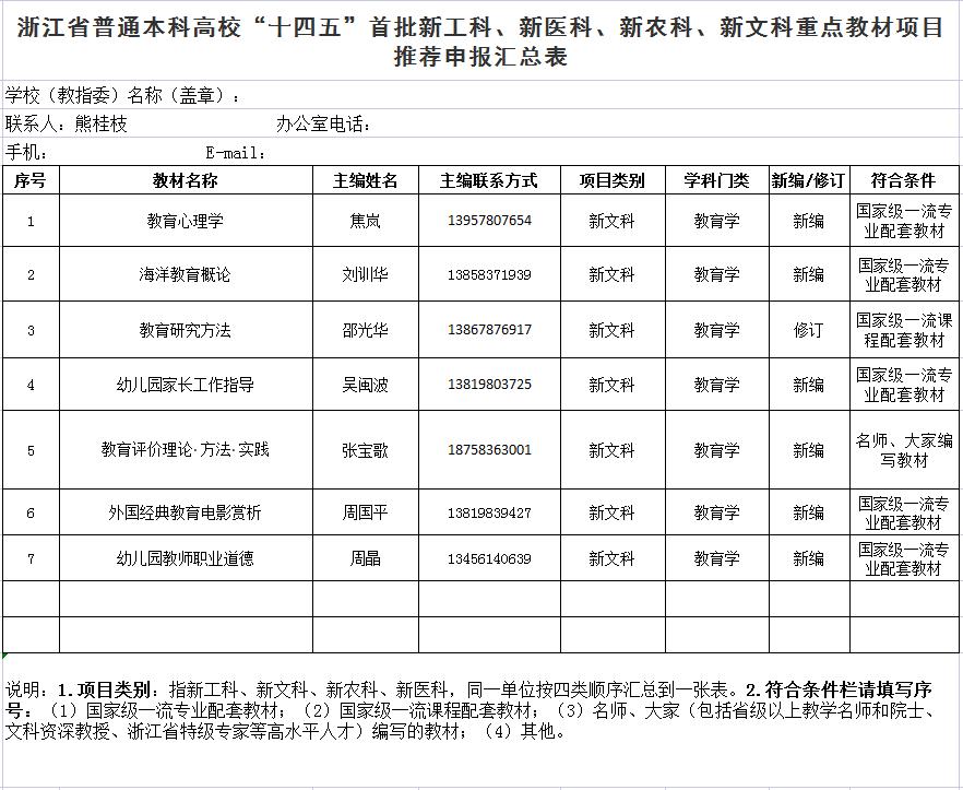 根据《关于开展浙江省普通本科高校“十四五”首批新工科、新医科、新农科、新文科重点教材建设项目申报工作的通知》要求,经会议评审,现对51黑料 推荐申报结果进行公示(排名不分先后,按姓氏拼音首字母顺序排序):