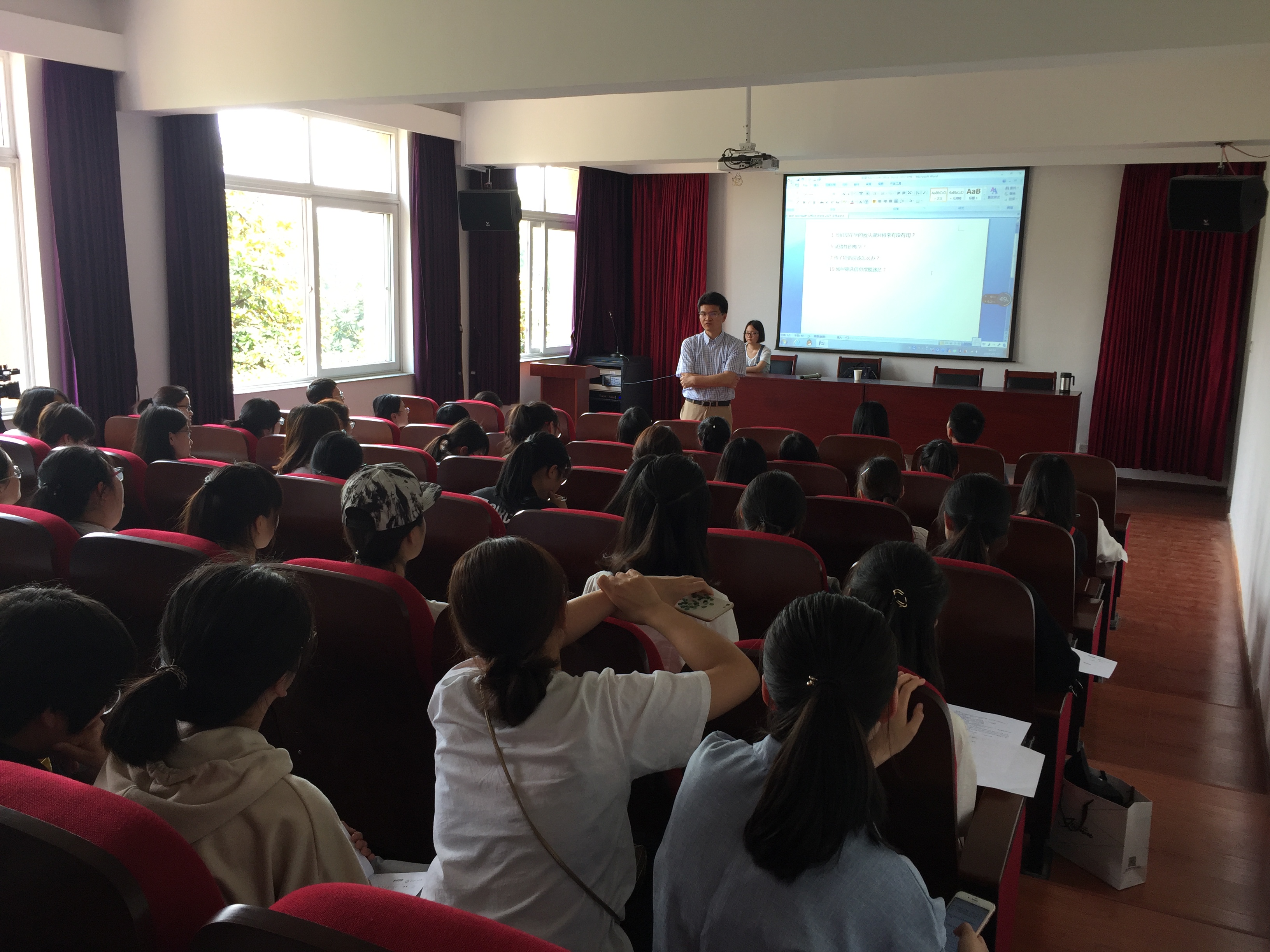 讲座开始,黄老师通过问题导入的方式,让同学们提出了十个关于学习、实践等方面感到最困惑的问题,并在之后的讲述中依次对这些问题作出了解答。黄老师围绕“学什么”给同学提出三点建议:首先,学好自己的专业,立足一门课,列书单,增长知识的同时也要兼顾教师基本功;其次,进行身体锻炼,做好“饮食有节,起居有常”;最后,心性的学问,要上进、自制、报恩、真诚、静下心。