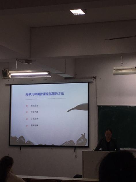 讲座开始,舒老师先分享了一些事例引起同学们的兴趣。舒老师讲解了用事例导入“掌控”,对教学的调控,根据课堂灵活掌控,并详细分析了课堂组织管理,课堂掌控能力,课堂即使反馈能力,创造情景,优化提问和有效评价。