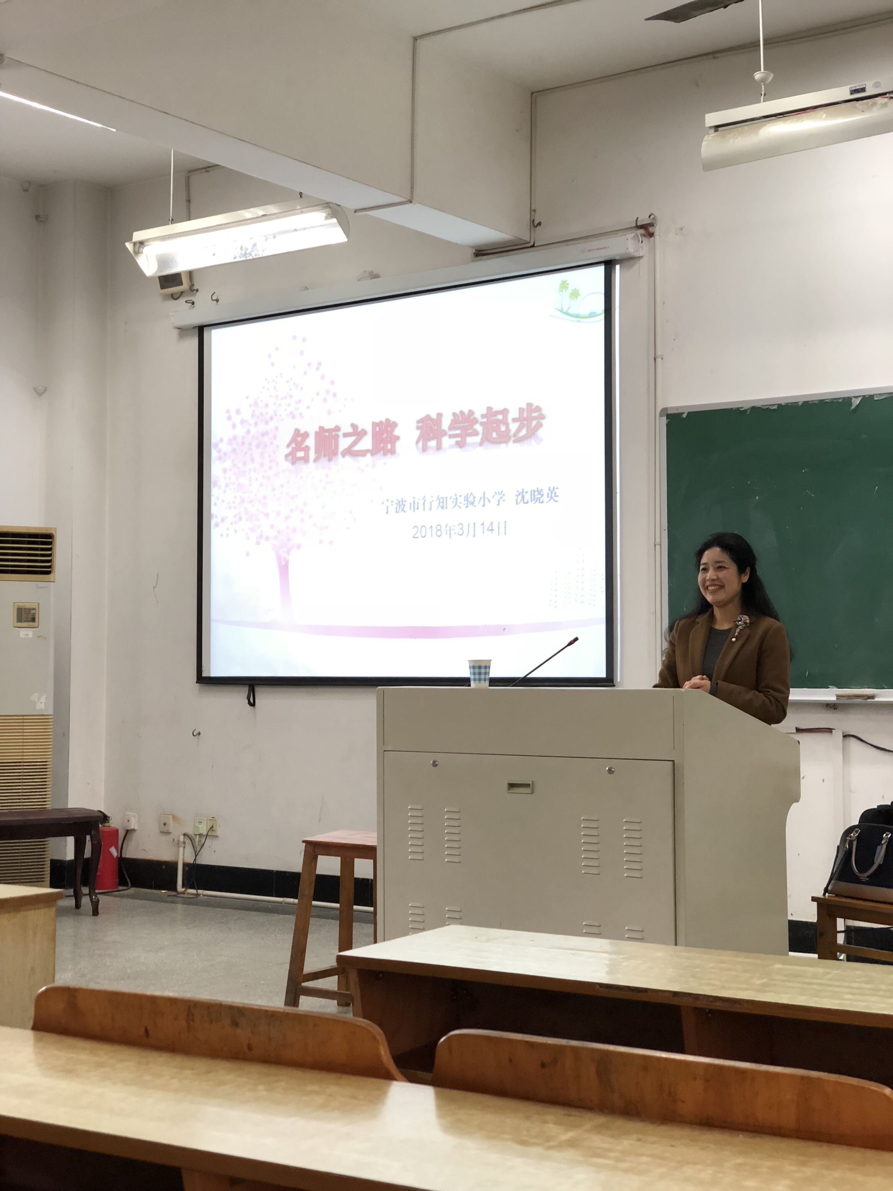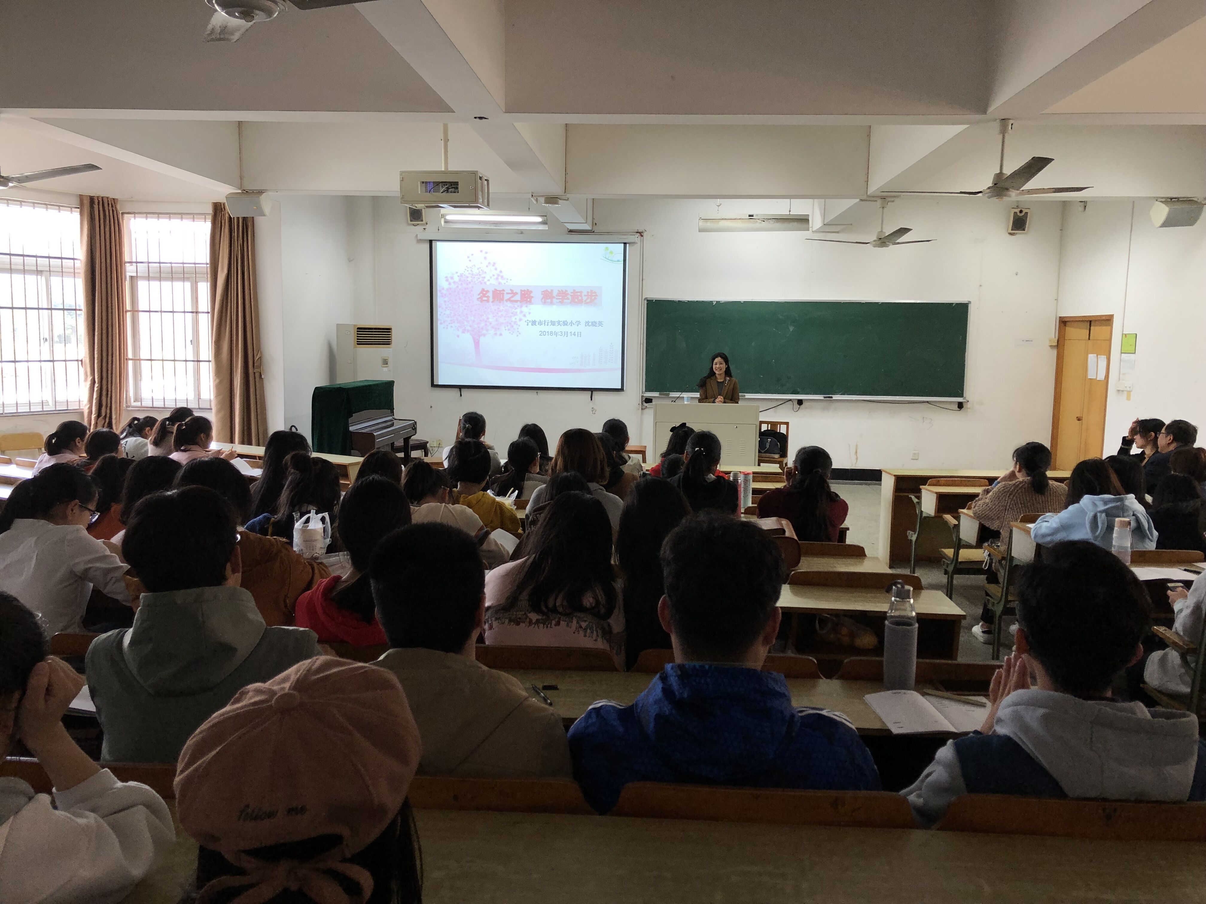 校长、特级教师沈晓英老师,17级小教专业各班学生前来听讲。讲座由小教系副主任王成如老师主持。