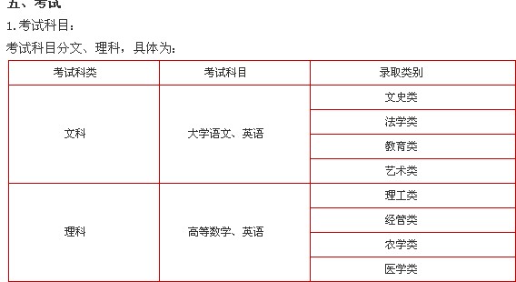 考试分文理、录取按类别。设文科、理科两个考试科类,文史、理工、经管、法学、教育、农学、医学、艺术八个录取类别。