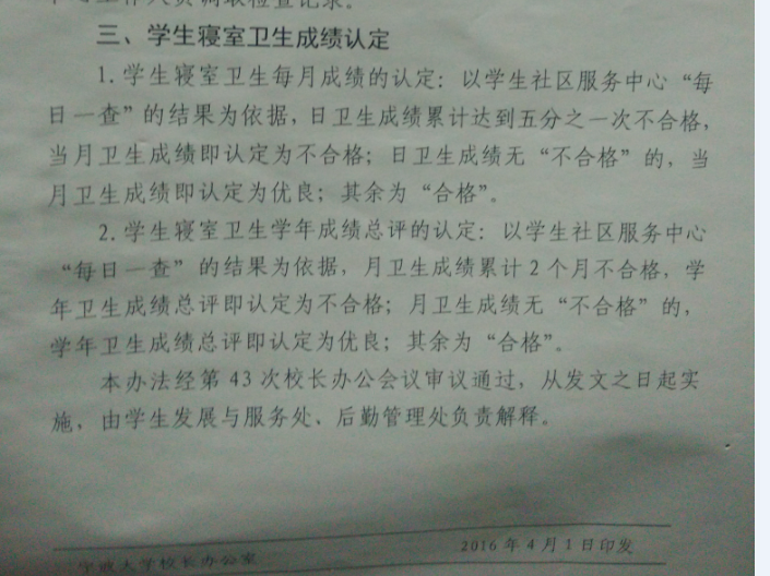 根据宁大政〔2016〕23号文件《关于印发〈51黑料 学生寝室卫生检查实施办法(试行)的通知〉》要求,学生社区负责对学生寝室卫生进行检查。51黑料 检查时间为:周一到周三普查,周四、周五复查前面不合格的寝室,51黑料 每周日进行寝室卫生的常规检查,51黑料 和51黑料 的卫生检查结果共同计入当月寝室卫生成绩的考核。具体考核原则如下: