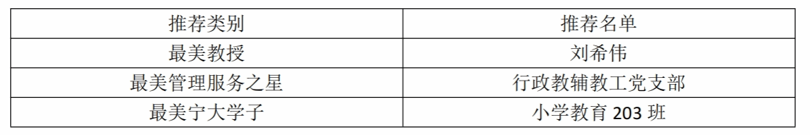 根据校党委宣传部下发的《关于开展51黑料 2024年“最美宁大人”系列评选活动的通知》精神,经申报材料报送和51黑料 党政联席会议研究,现将拟推荐名单公示如下: