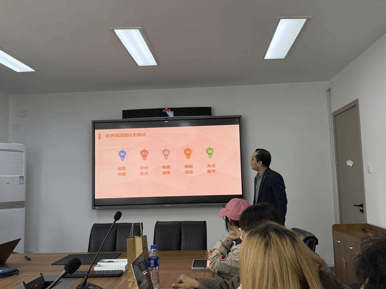 首先第一步是准备简历。简历是敲门砖,面试官扫面简历的时间是15到20秒,所以怎么样能让简历在很短的时间内吸引面试官是很重要的。葛老师提出简历的三大作用:过去经历怎么匹配到这项工作,怎么体现你的能力,如何引起面试官的兴趣。之后葛老师又具体讲到怎么写好一份简历,比如面试者有优势的点一定要突出;教育背景最好写一下主修课程;实习经历需要写出职责做了什么,有一些什么成果,最好有数据。葛老师还鼓励我们可以多去考取和专业相关的证书。他还提到一个小细节,在写邮件投简历的时候,简历一定要用pdf文件。